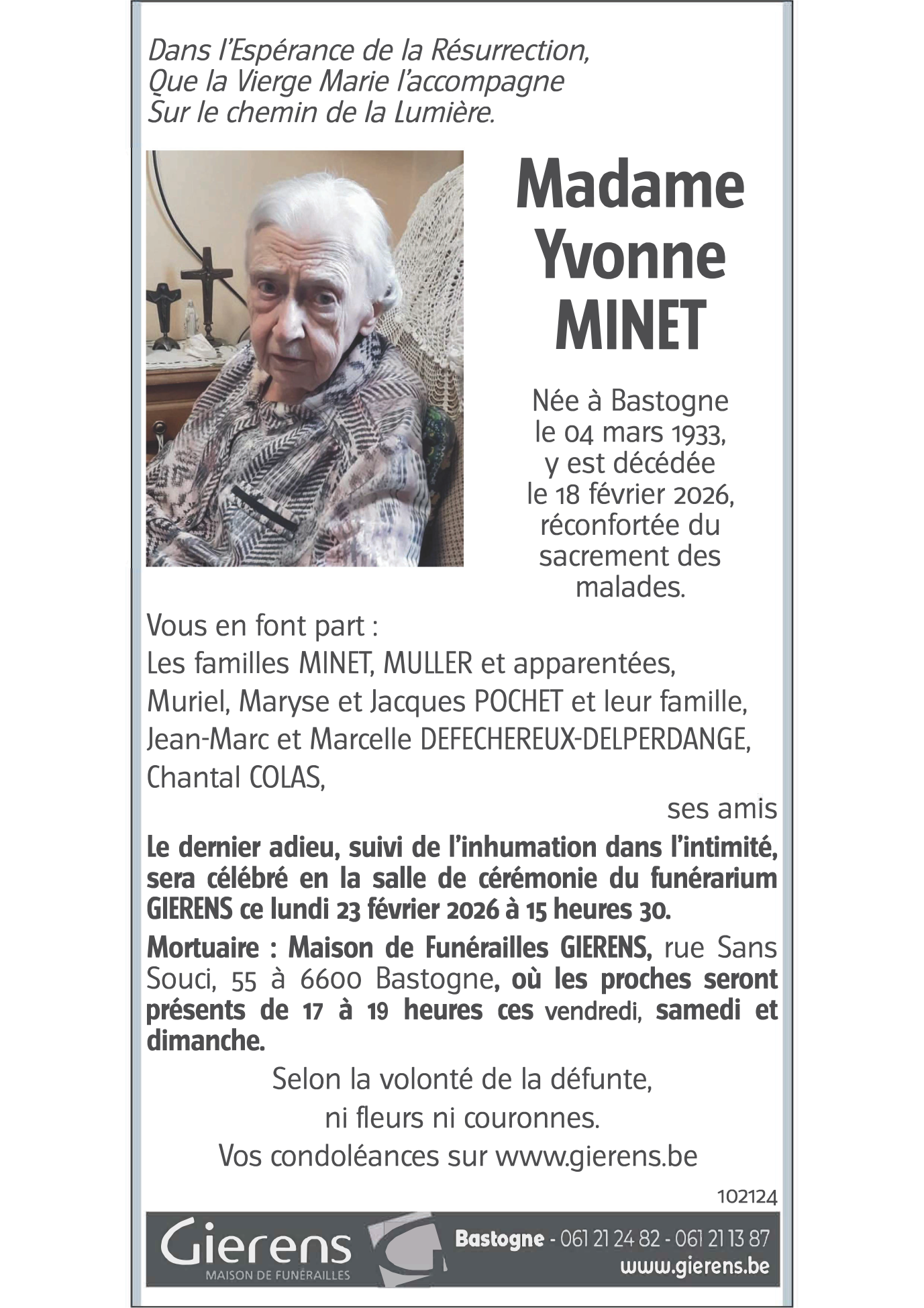 Décédée à Bastogne (6600, Belgique) le mercredi 18 février 2026 à l'âge de 92 ans