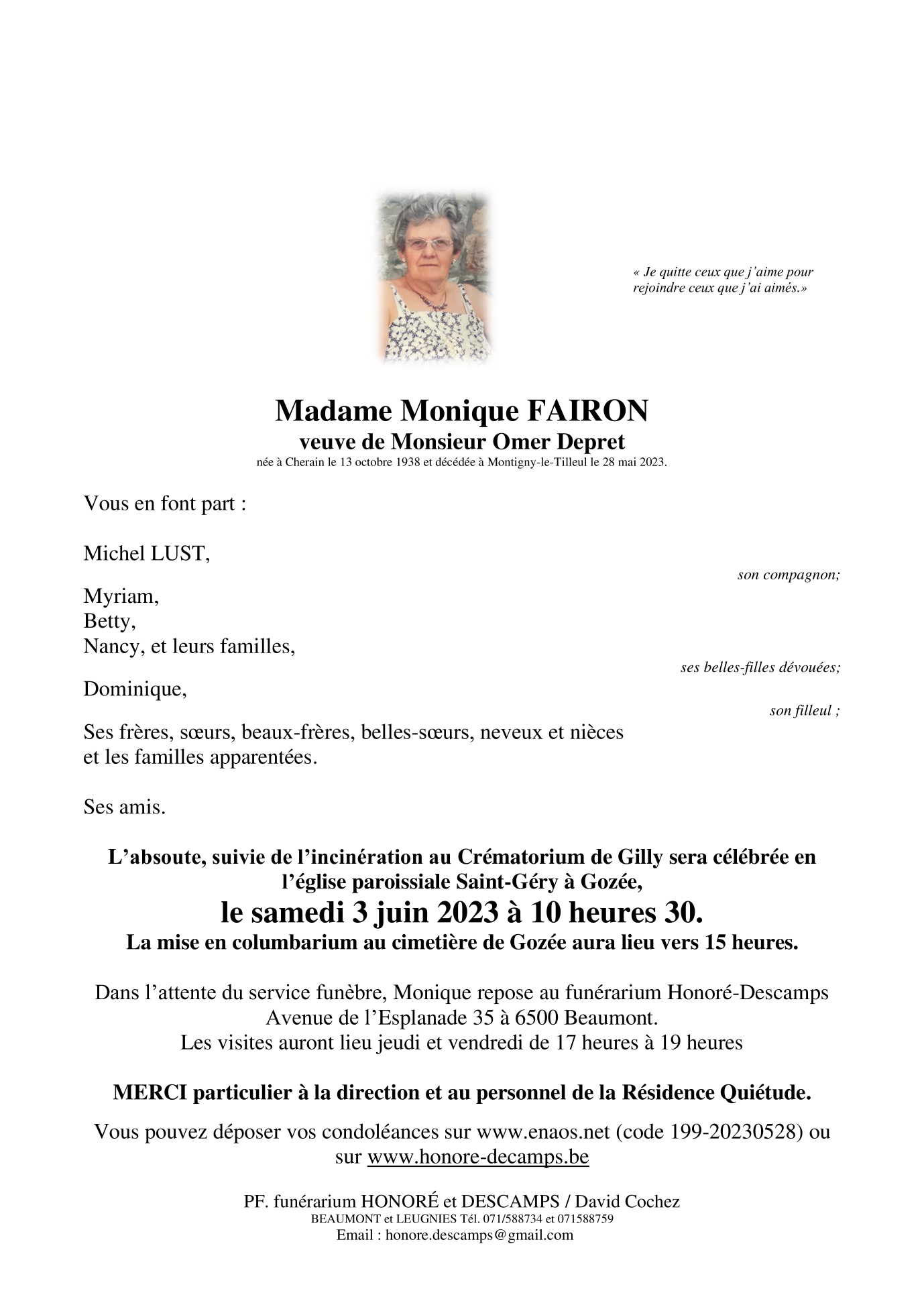 Décédée à Montigny-le-Tilleul (6110, Belgique) le dimanche 28 mai 2023 à l'âge de 84 ans
