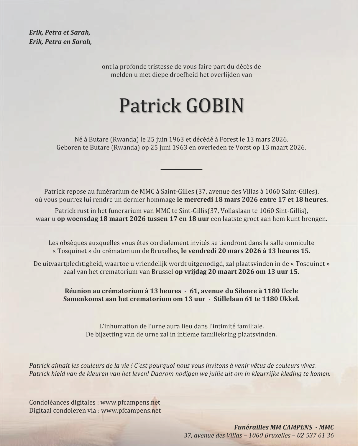 Décédé à Forest (1190, Belgique) le vendredi 13 mars 2026 à l'âge de 62 ans