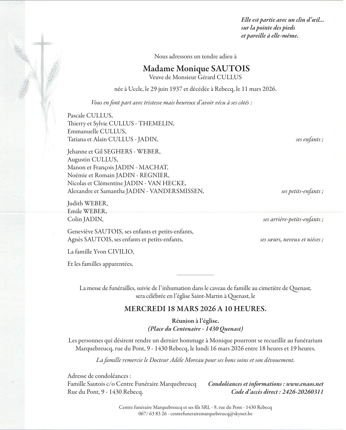 Weduwe van Monsieur Gérard CULLUS