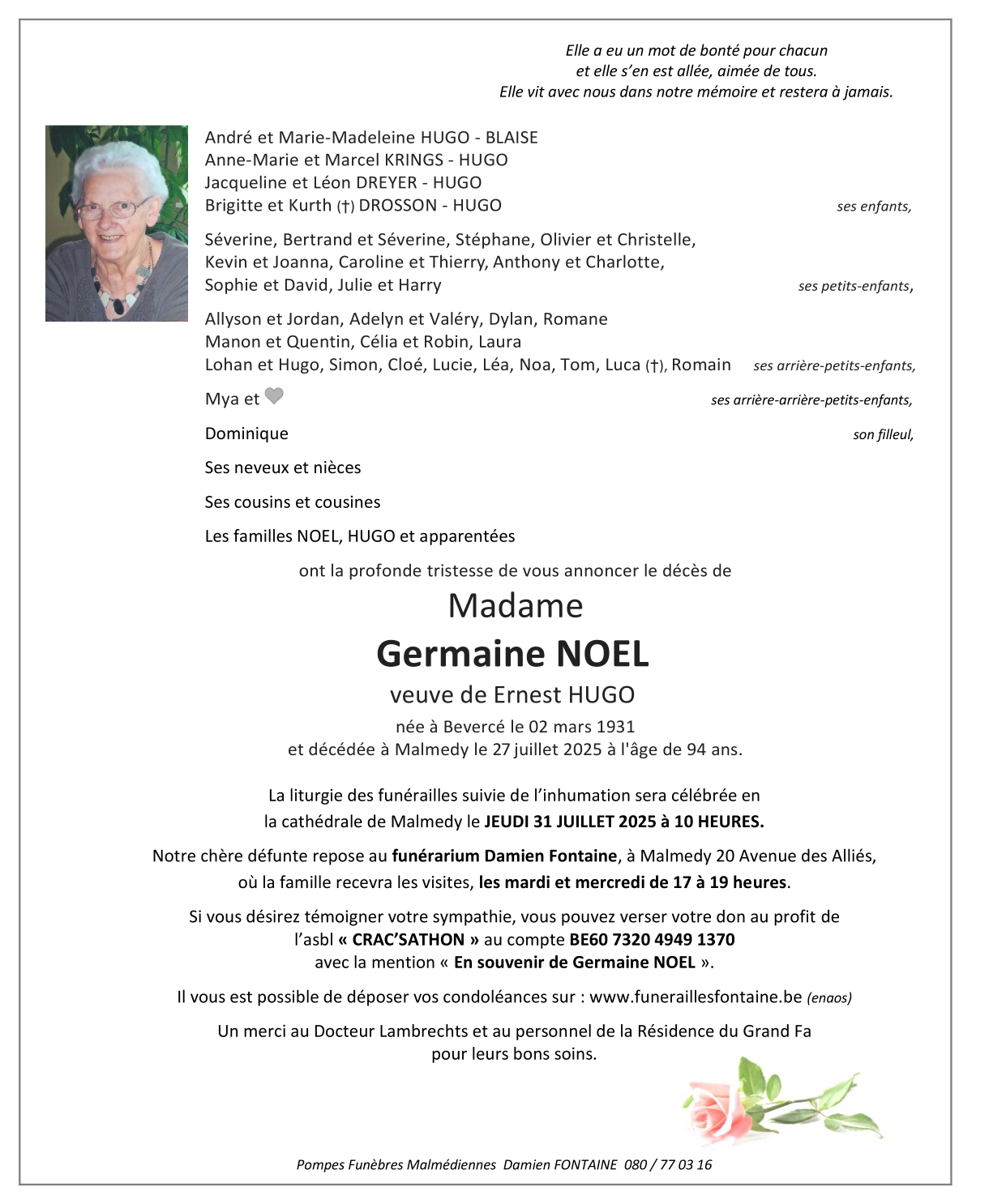 Décédée à Malmedy (4960, Belgique) le dimanche 27 juillet 2025 à l'âge de 94 ans