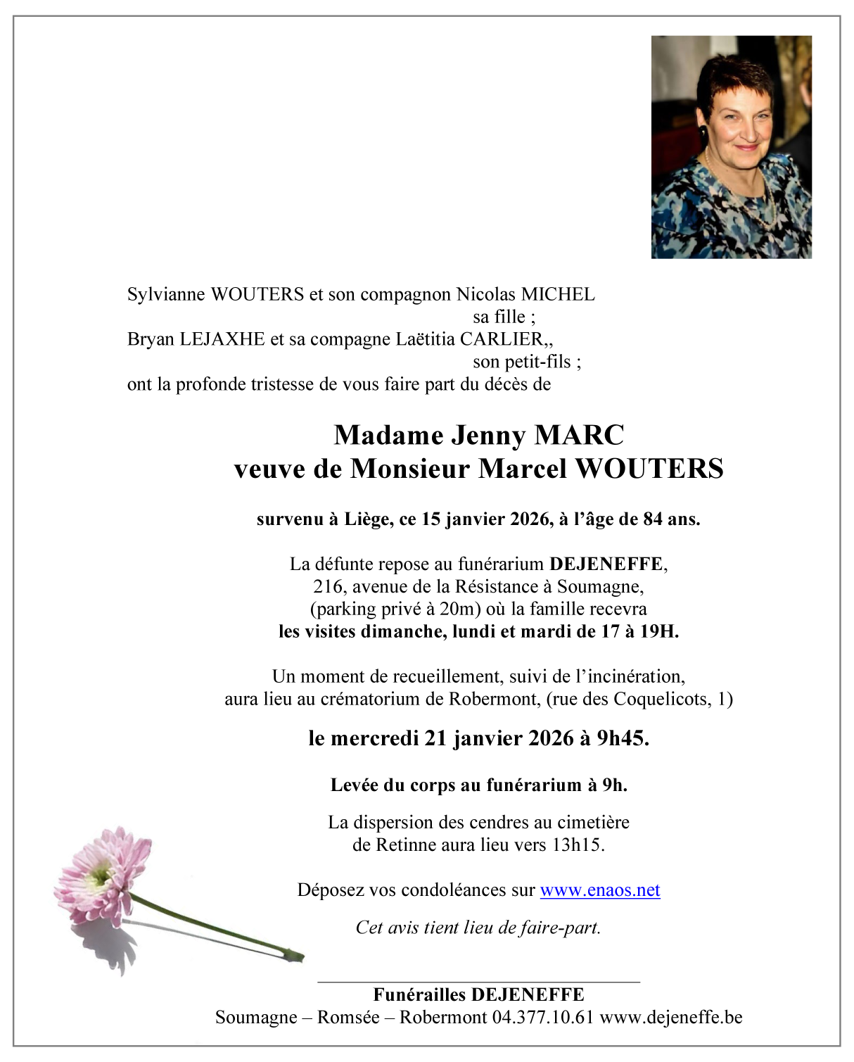 Décédée à Liège (Belgique) le jeudi 15 janvier 2026 à l'âge de 84 ans