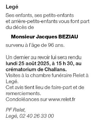 Décédé à Touvois (44650, France) le jeudi 21 août 2025 à l'âge de 96 ans