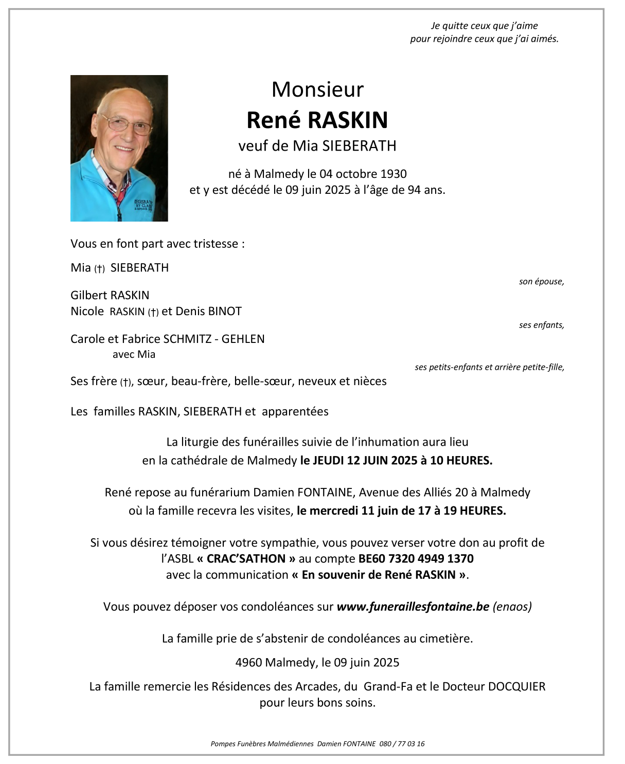 Décédé à Malmedy (4960, Belgique) le lundi 9 juin 2025 à l'âge de 94 ans