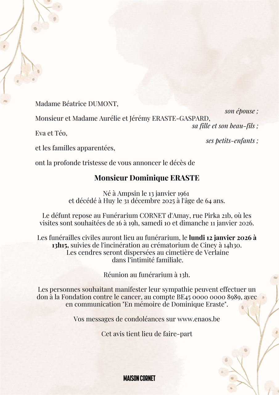 Décédé à Huy (4500, Belgique) le mercredi 31 décembre 2025 à l'âge de 64 ans