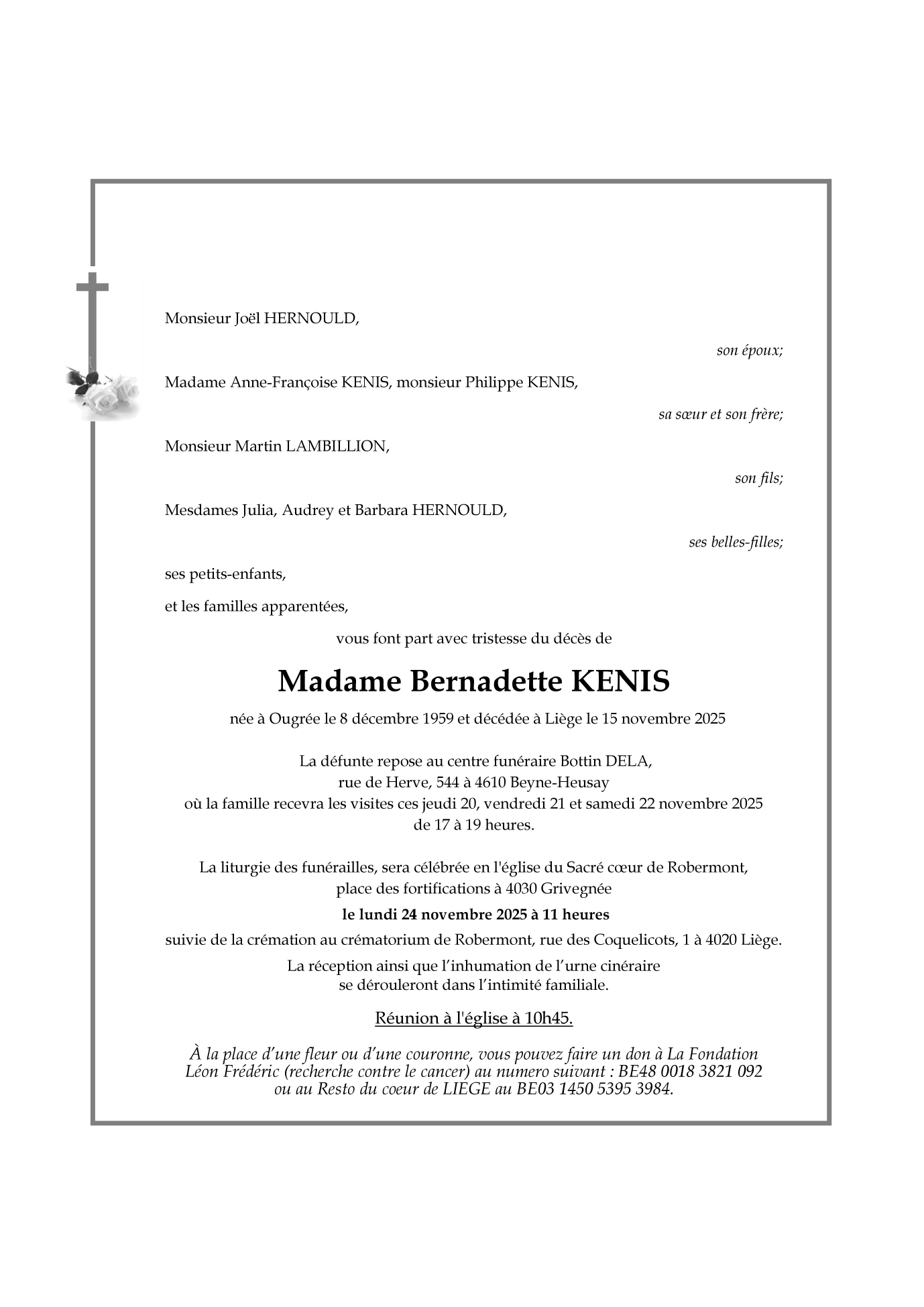 Décédée à Liège (4000, Belgique) le samedi 15 novembre 2025 à l'âge de 65 ans
