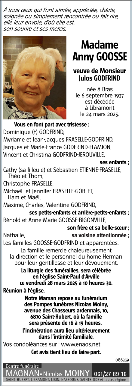 Décédée à Libramont (6800, Belgique) le lundi 24 mars 2025 à l'âge de 87 ans