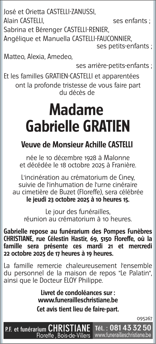Décédée à Floreffe (5150, Belgique) le samedi 18 octobre 2025 à l'âge de 96 ans