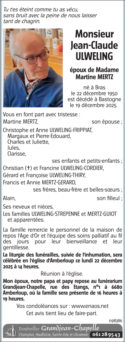 Overleden te Bastogne (6600, België) op vrijdag 19 december 2025 op 74-jarige leeftijd