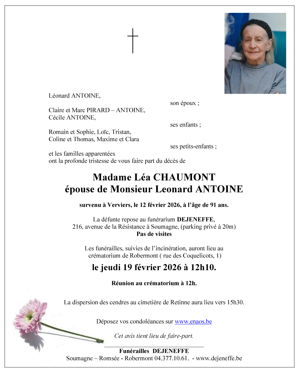 Fallecida en Verviers (4800, Bélgica) el jueves, 12 de febrero de 2026 a la edad de 91 años