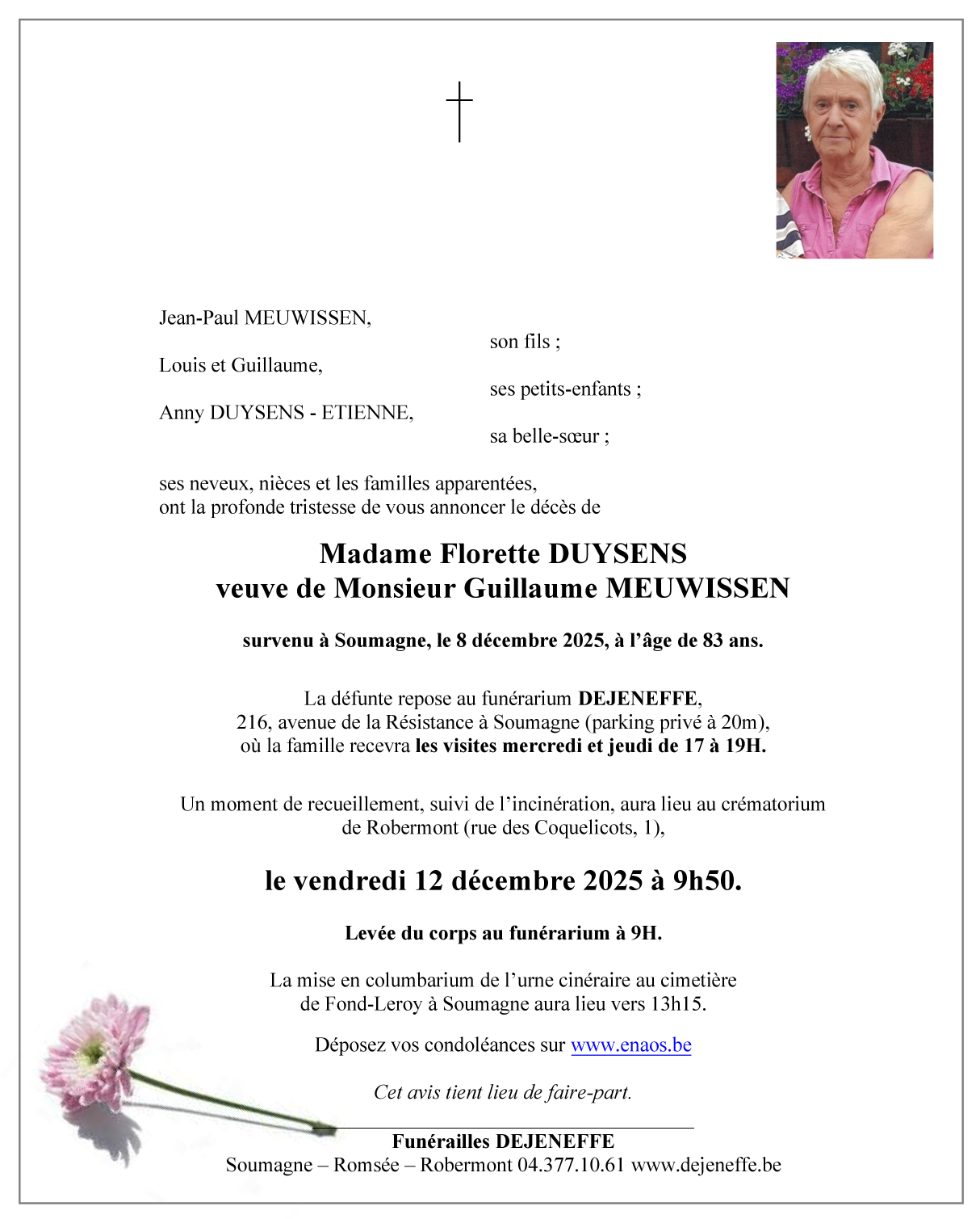 Décédée à Soumagne (4630, Belgique) le lundi 8 décembre 2025 à l'âge de 83 ans