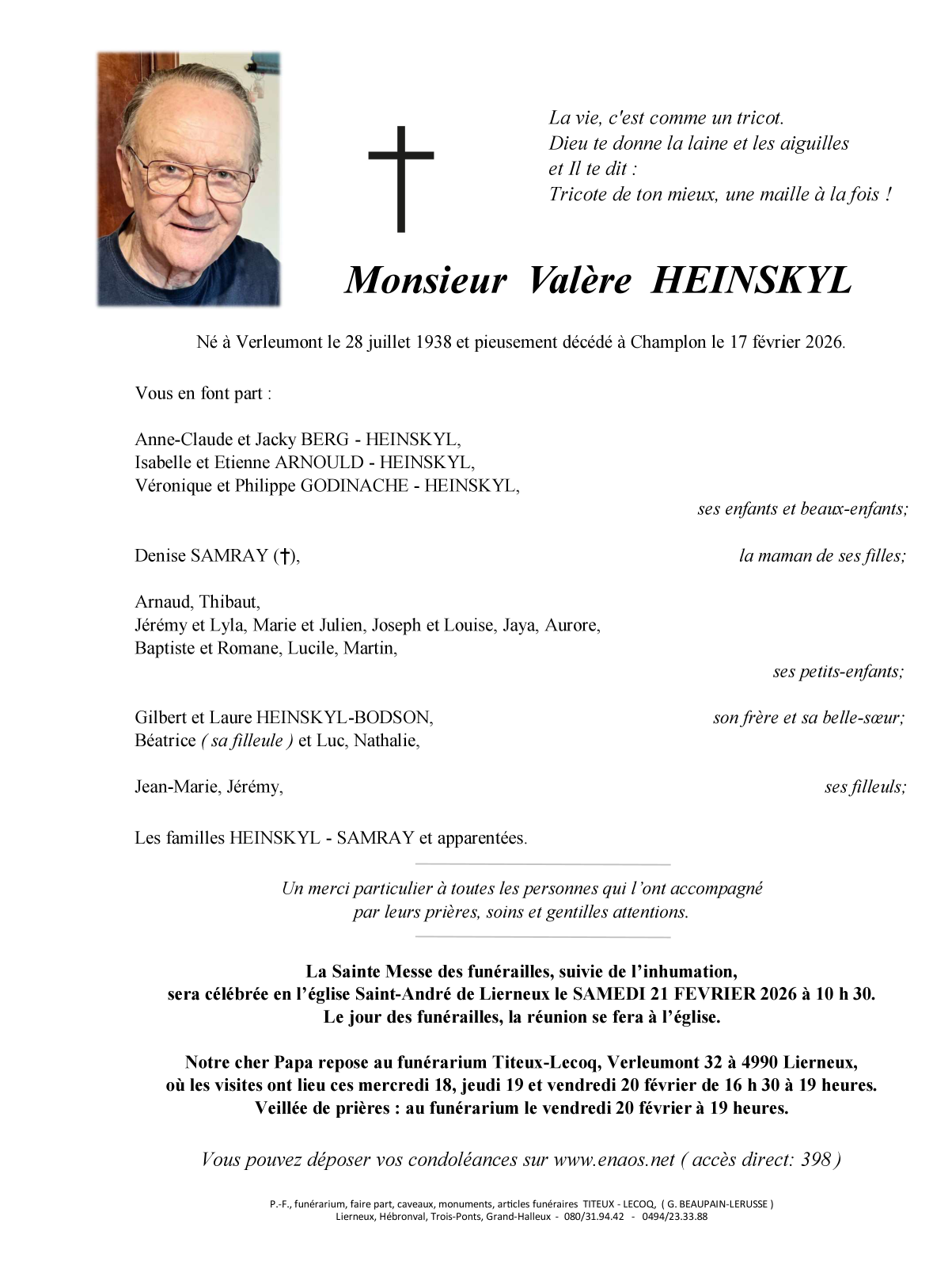 Né à Verleumont (4990, Belgique) le jeudi 28 juillet 1938