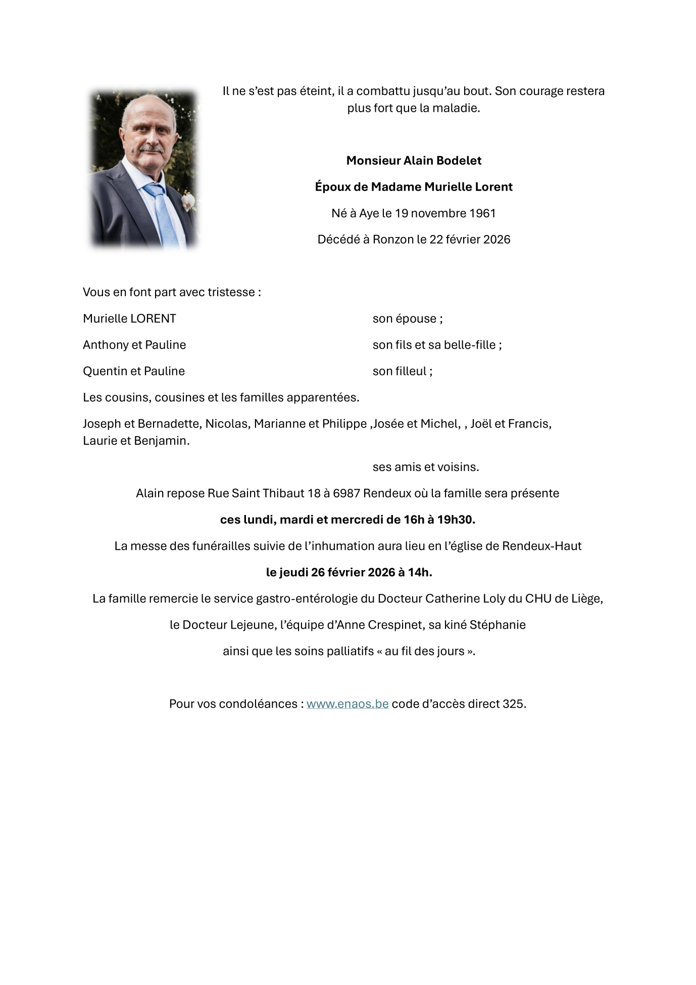 Overleden te Rendeux (6987, België) op zondag 22 februari 2026 op 64-jarige leeftijd