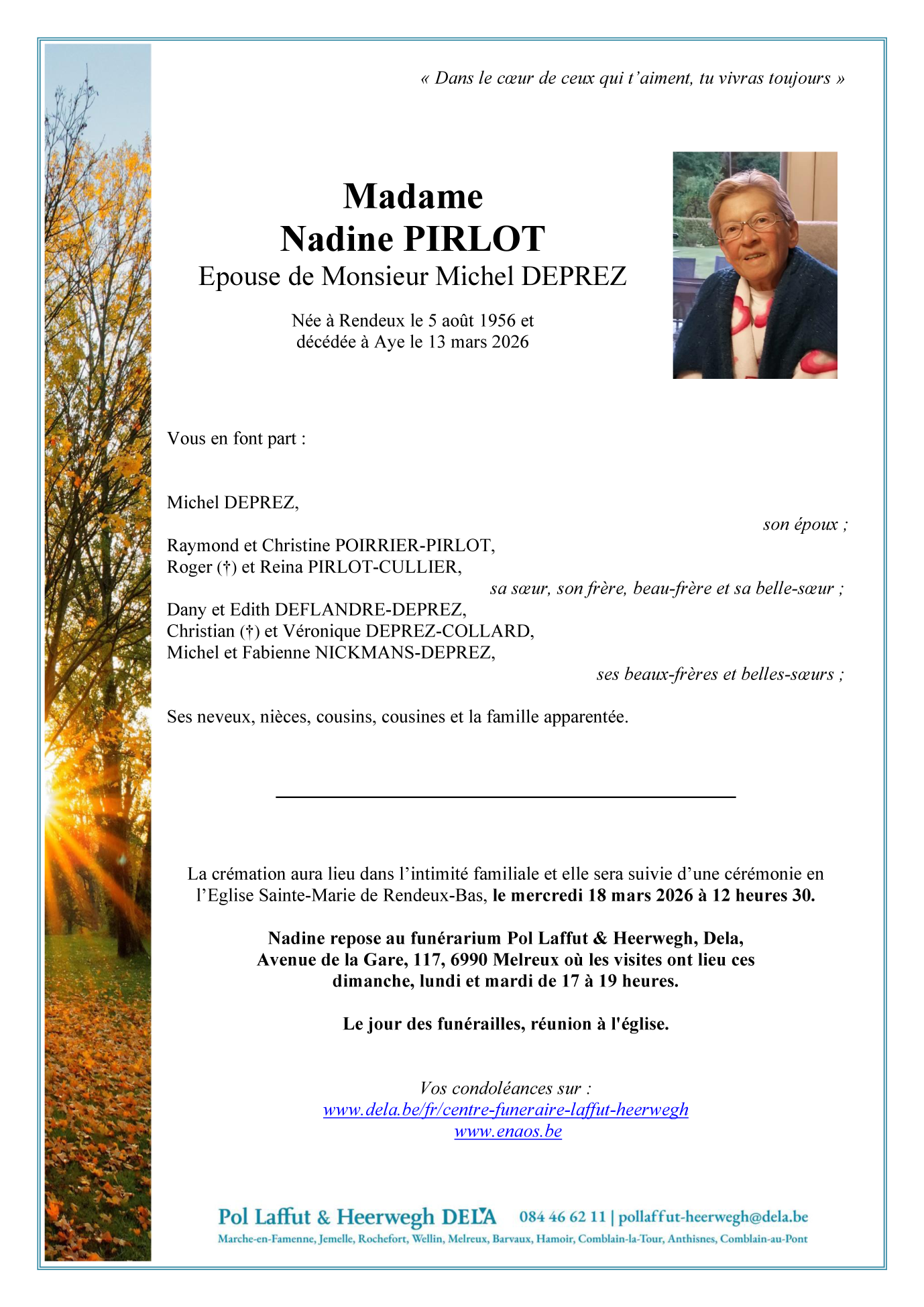 Décédée à Aye (6900, Belgique) le vendredi 13 mars 2026 à l'âge de 69 ans