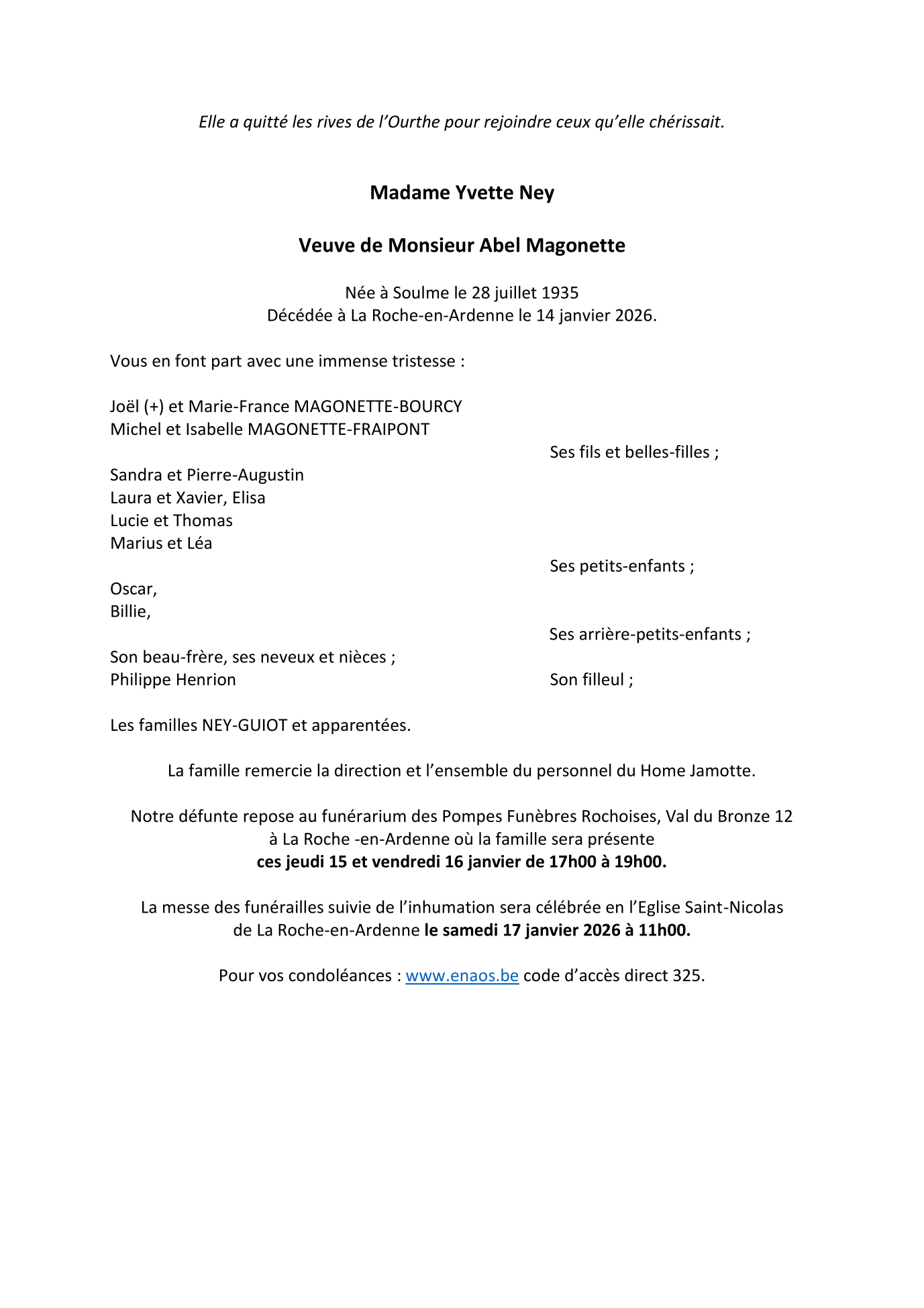 Décédée à La Roche-en-Ardenne (6980, Belgique) le mercredi 14 janvier 2026 à l'âge de 90 ans