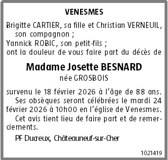 Décédée à Venesmes (18190, France) le mercredi 18 février 2026 à l'âge de 88 ans
