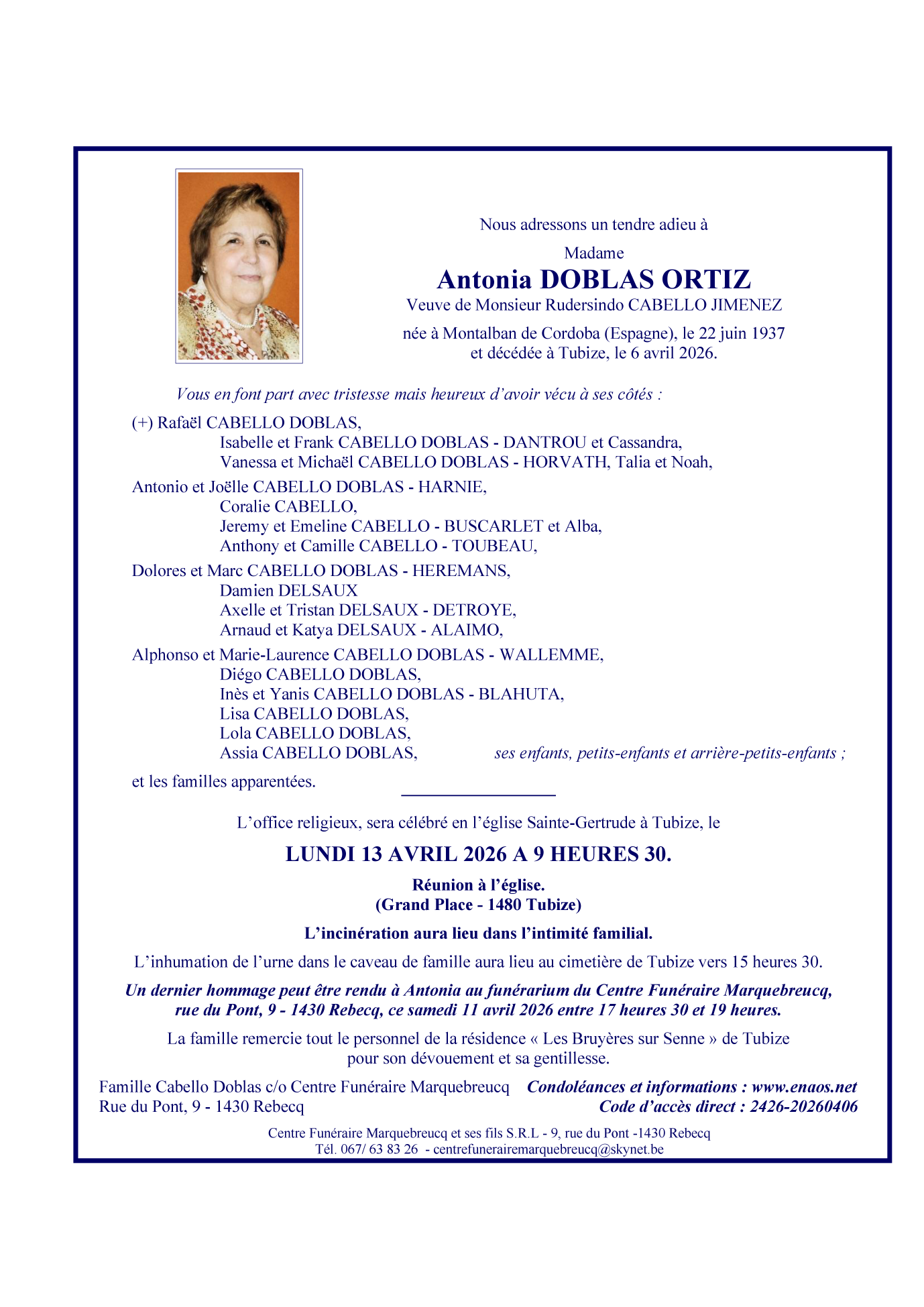 Died in Tubize (1480, Belgium) on 06 April 2026 at the age of 88 years