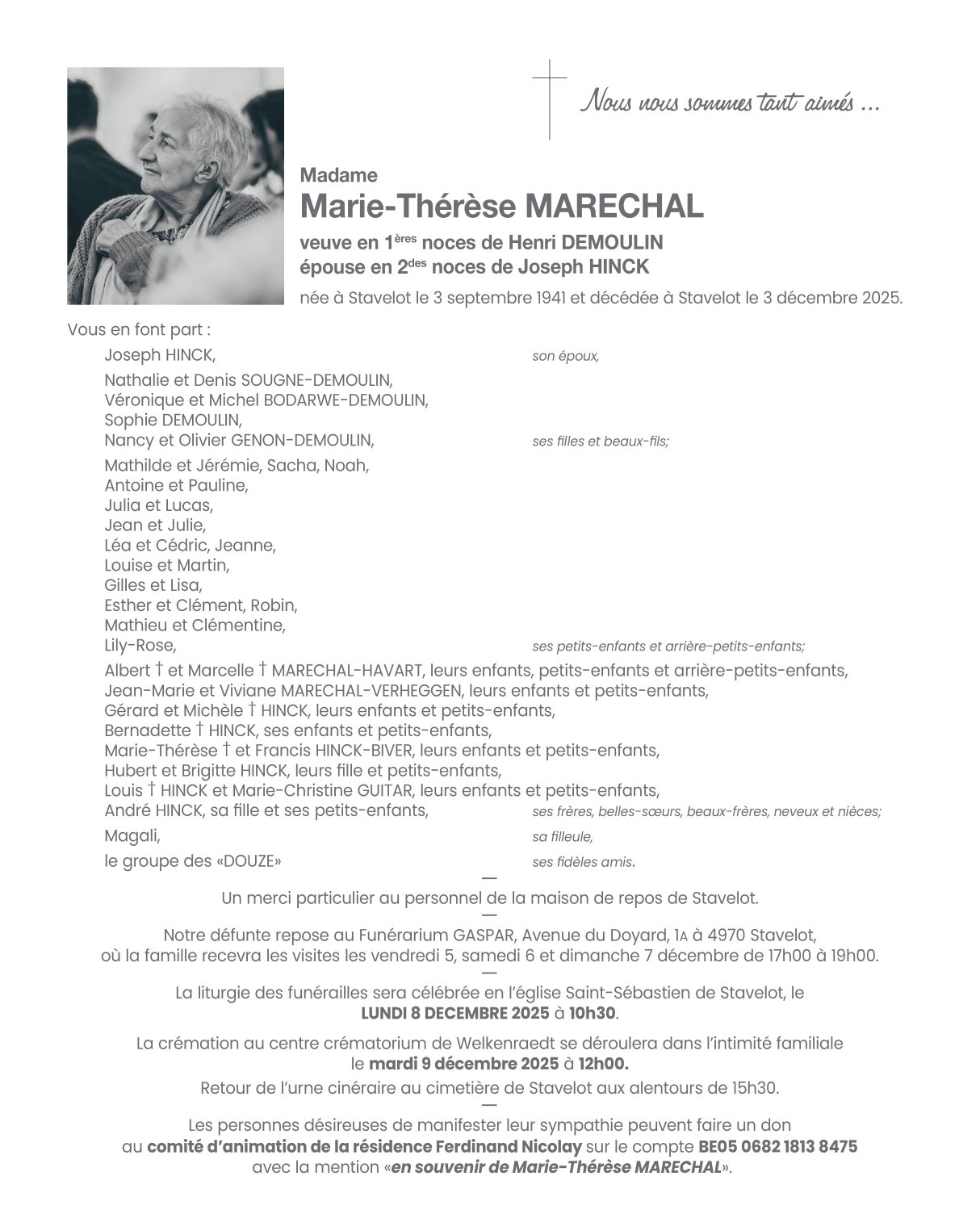 Fallecida en Stavelot (4970, Bélgica) el miércoles, 3 de diciembre de 2025 a la edad de 84 años