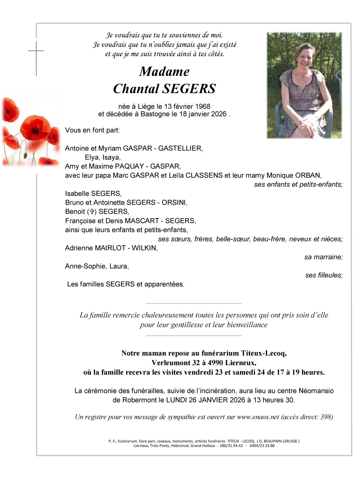 Décédée à Bastogne (6600, Belgique) le dimanche 18 janvier 2026 à l'âge de 57 ans