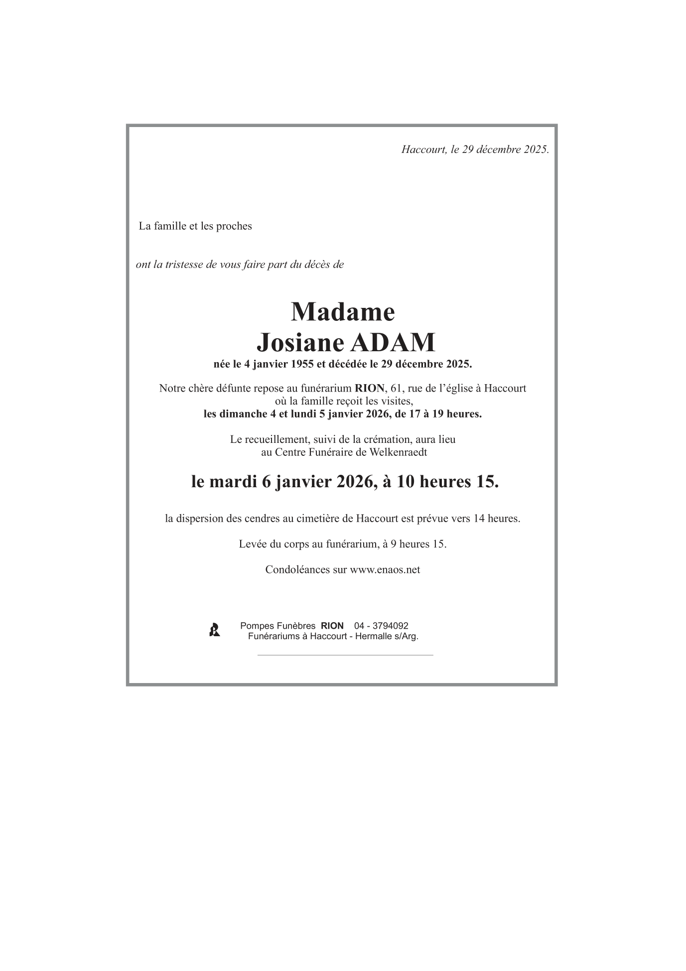 Overleden te Blegny (4670, België) op maandag 29 december 2025 op 70-jarige leeftijd