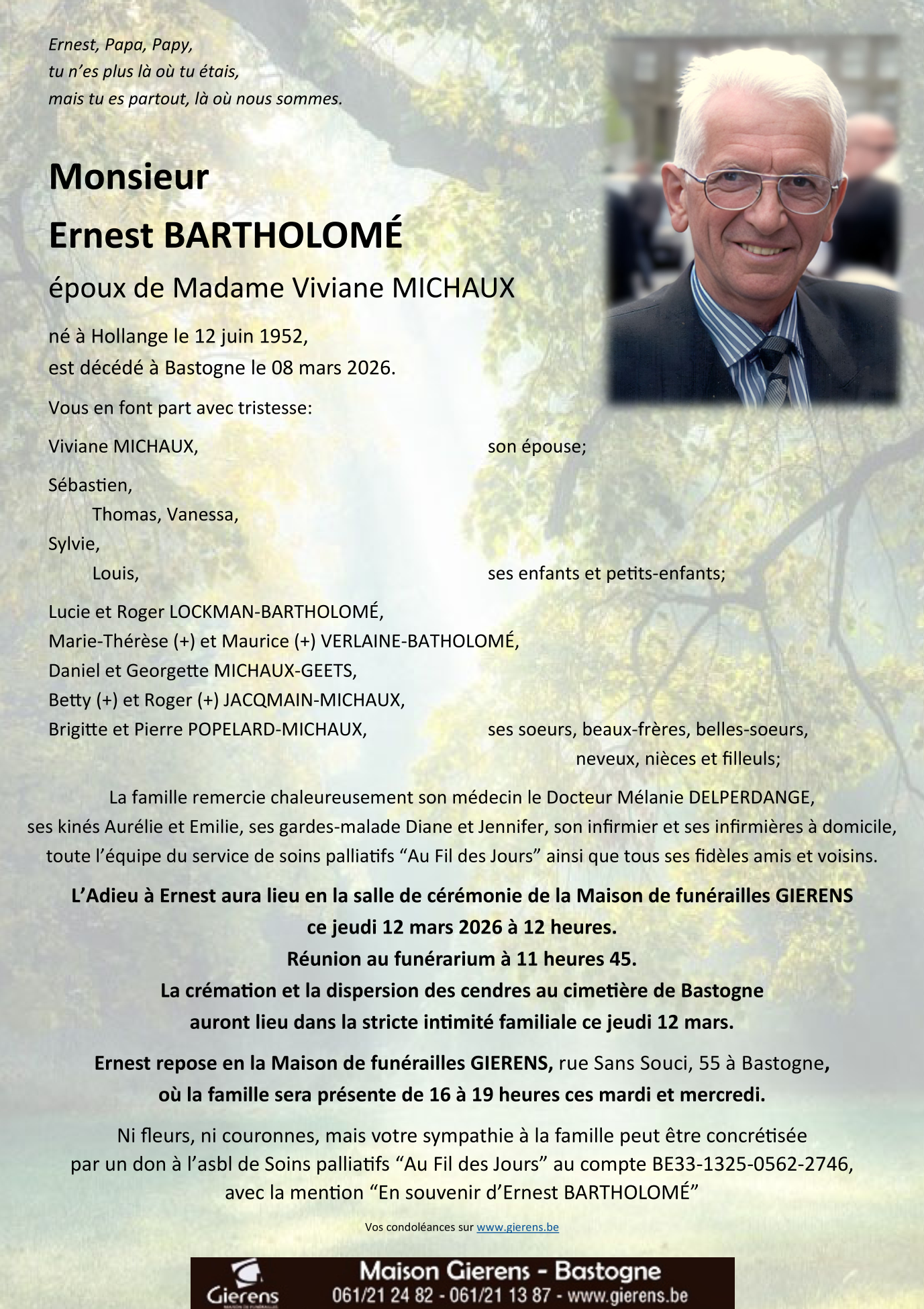 Overleden te Bastogne (6600, België) op zondag 8 maart 2026 op 73-jarige leeftijd
