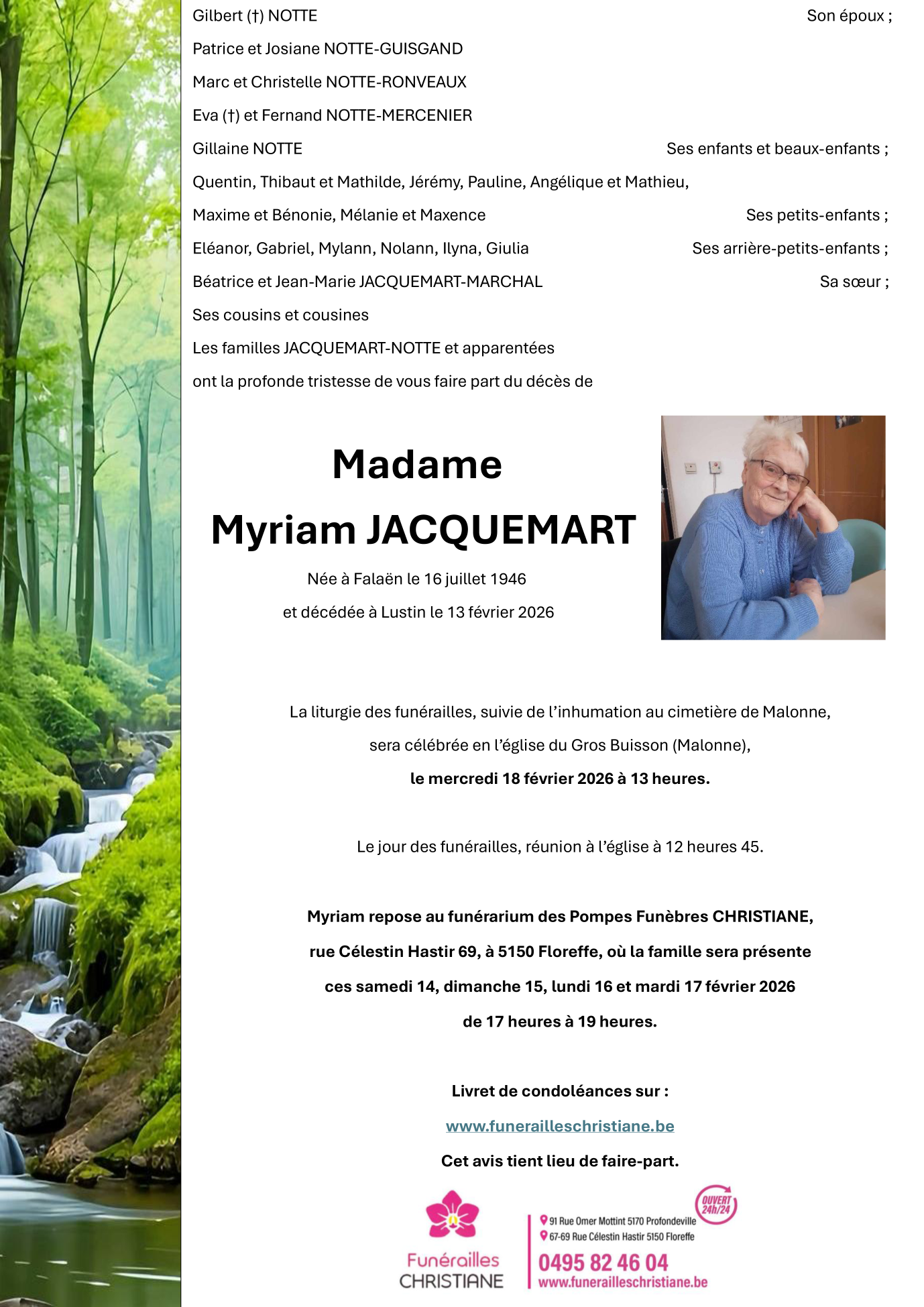Décédée à Lustin (5170, Belgique) le vendredi 13 février 2026 à l'âge de 79 ans