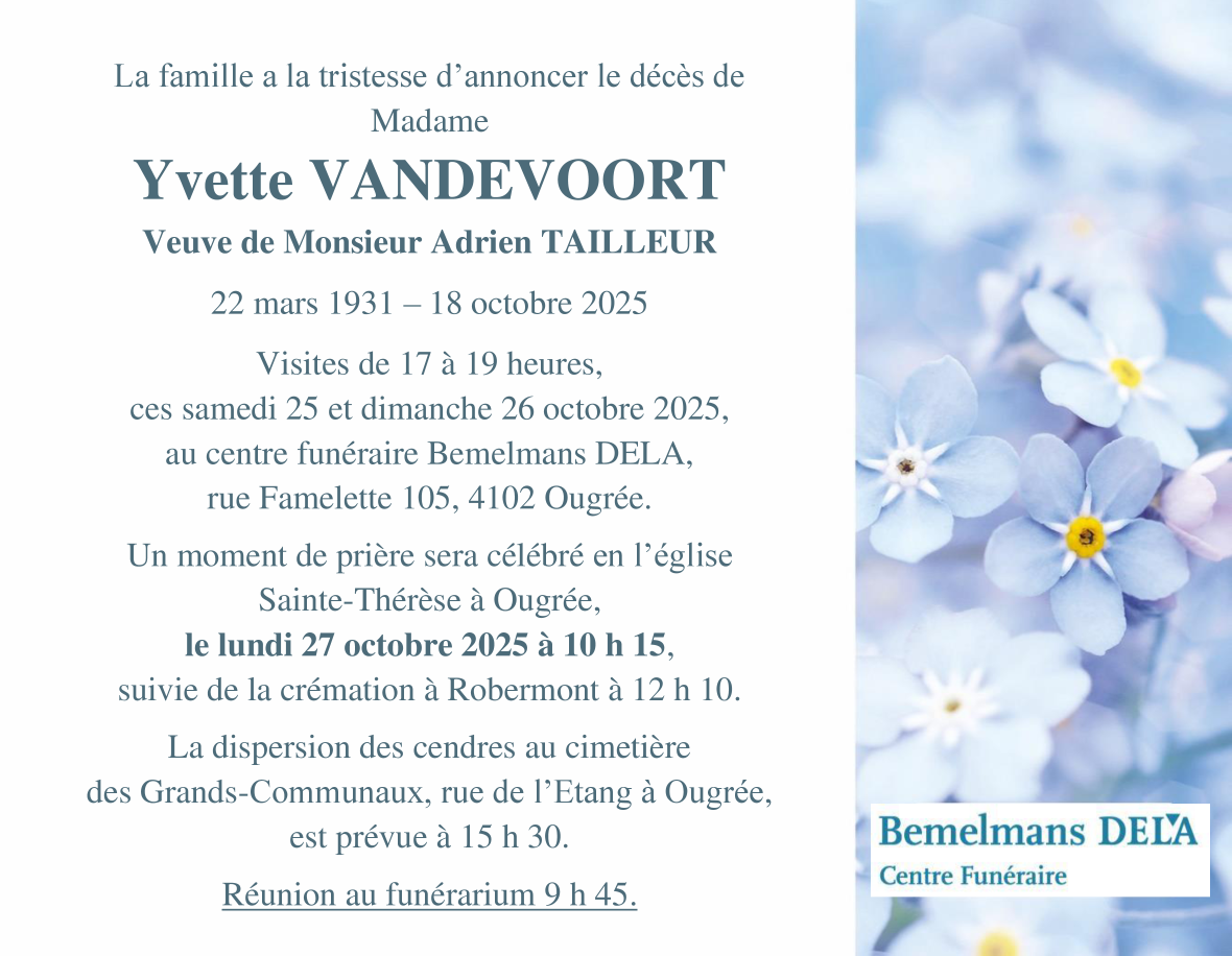 Décédée à Beaufays (4052, Belgique) le samedi 18 octobre 2025 à l'âge de 94 ans