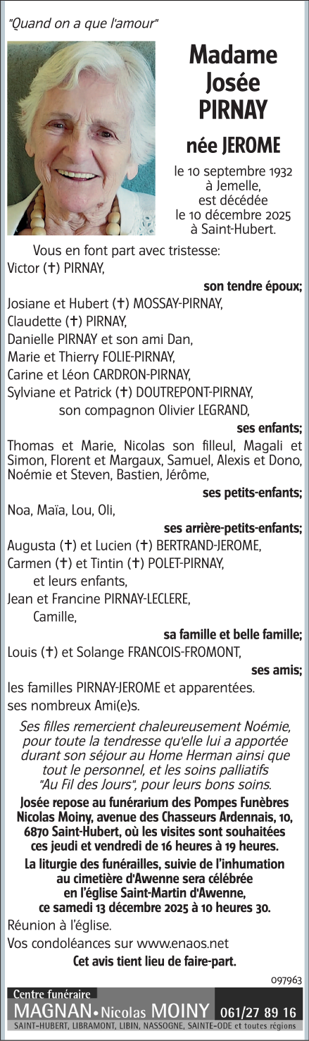Décédée à Saint-Hubert (6870, Belgique) le mercredi 10 décembre 2025 à l'âge de 93 ans
