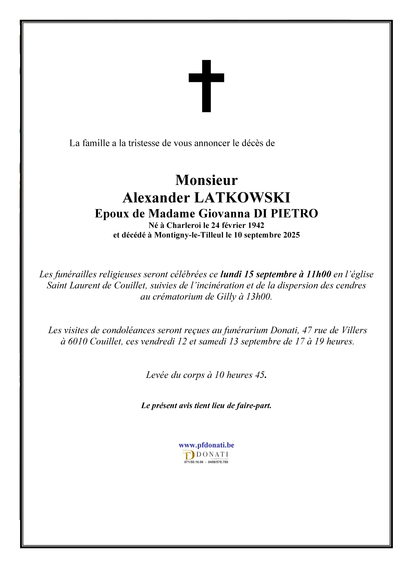 Décédé à Montigny-le-Tilleul (6110, Belgique) le mercredi 10 septembre 2025 à l'âge de 83 ans