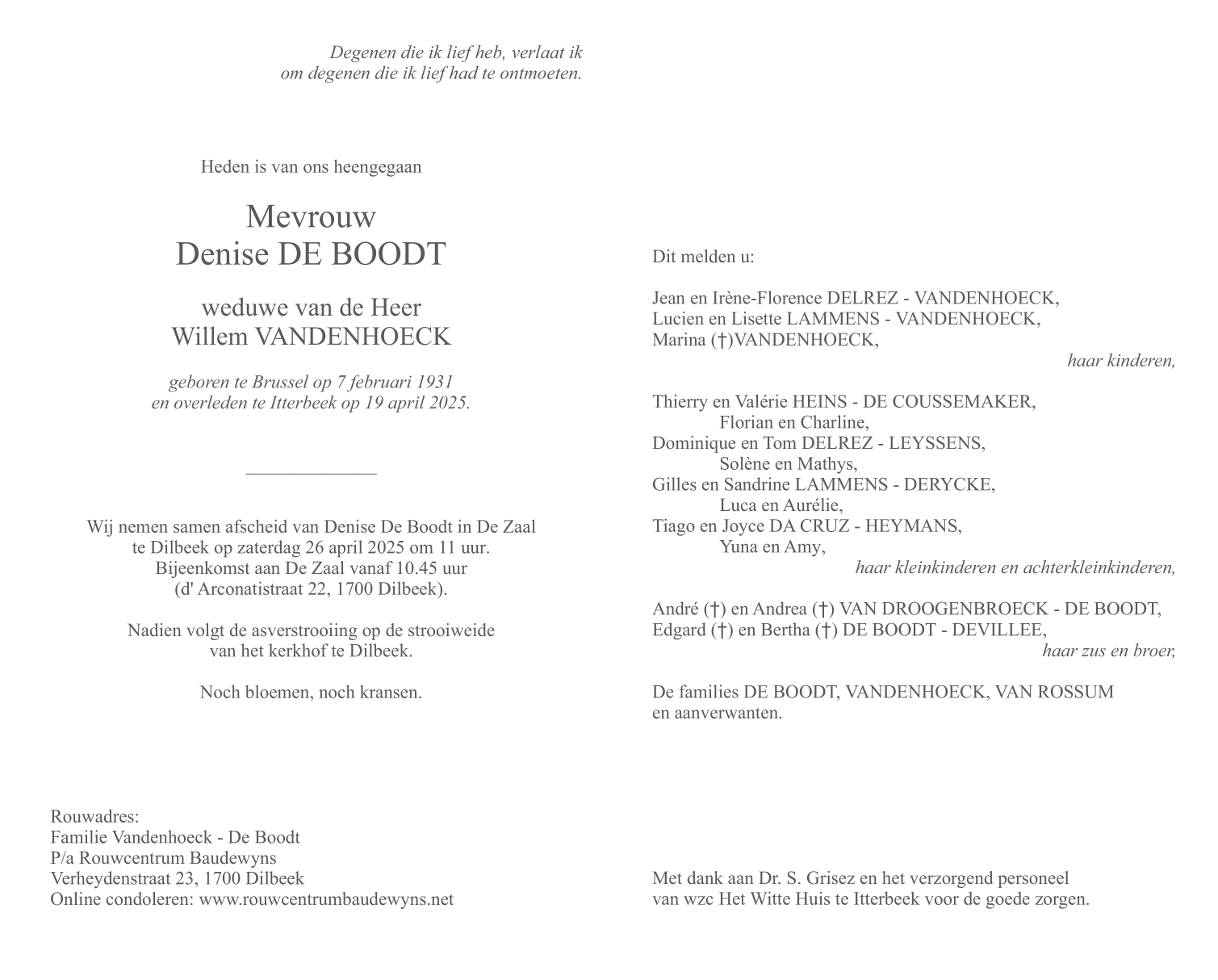 Décédée à Itterbeek (1701, Belgique) le samedi 19 avril 2025 à l'âge de 94 ans