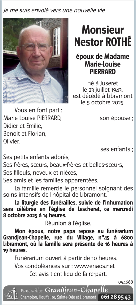 Décédé à Libramont (6800, Belgique) le dimanche 5 octobre 2025 à l'âge de 82 ans