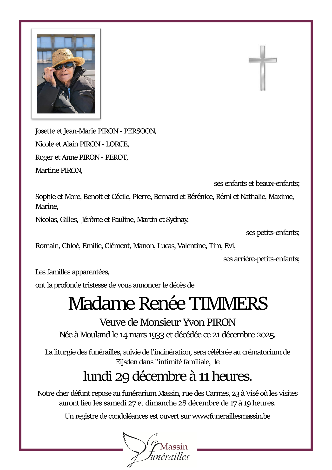 Madame Renée TIMMERS Vve de Yvon PIRON