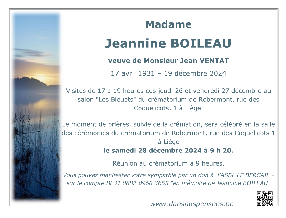Fallecida en Liège (4020, Bélgica) el jueves, 19 de diciembre de 2024 a la edad de 93 años