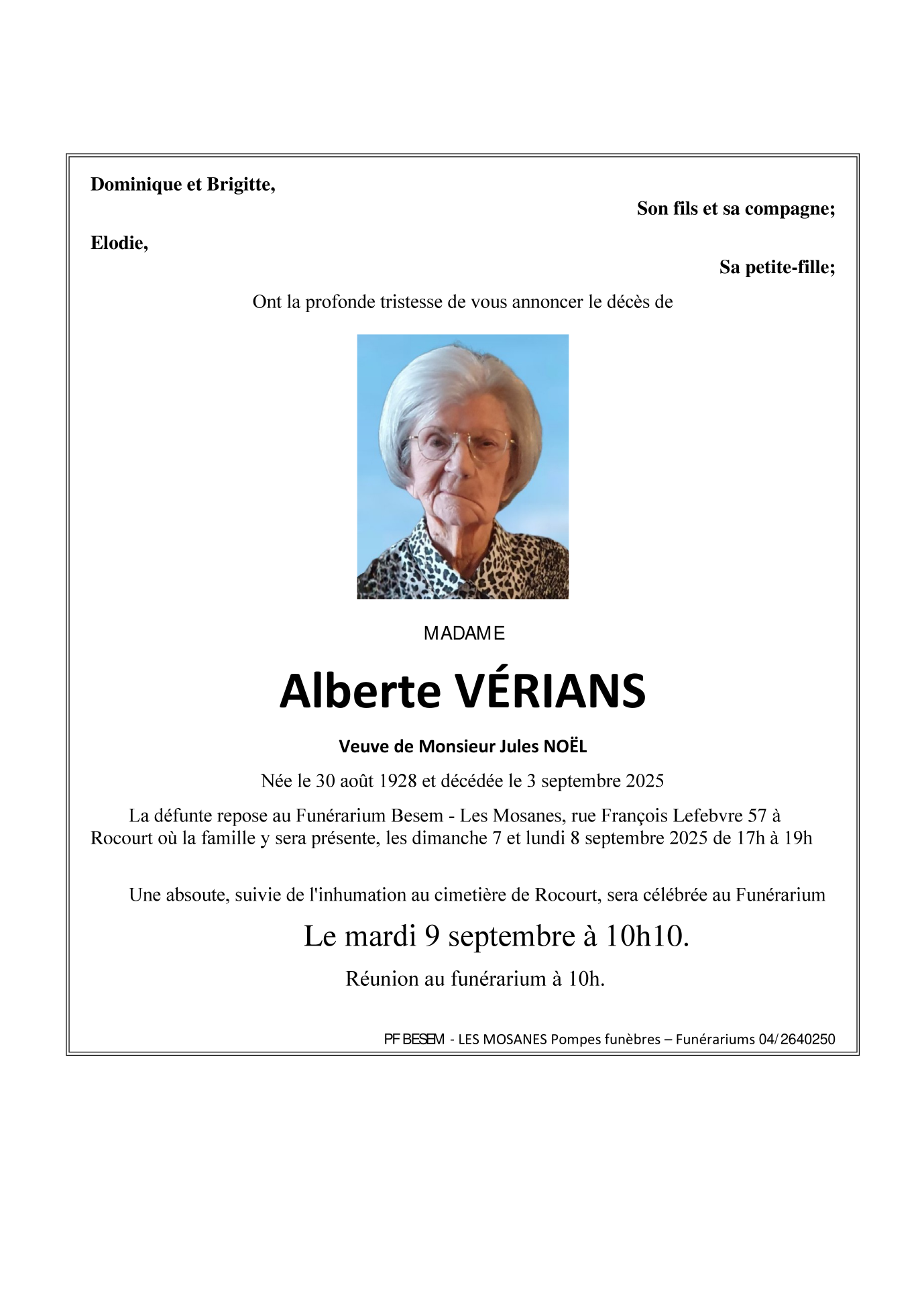 Décédée à Liège (4000, Belgique) le mercredi 3 septembre 2025 à l'âge de 97 ans