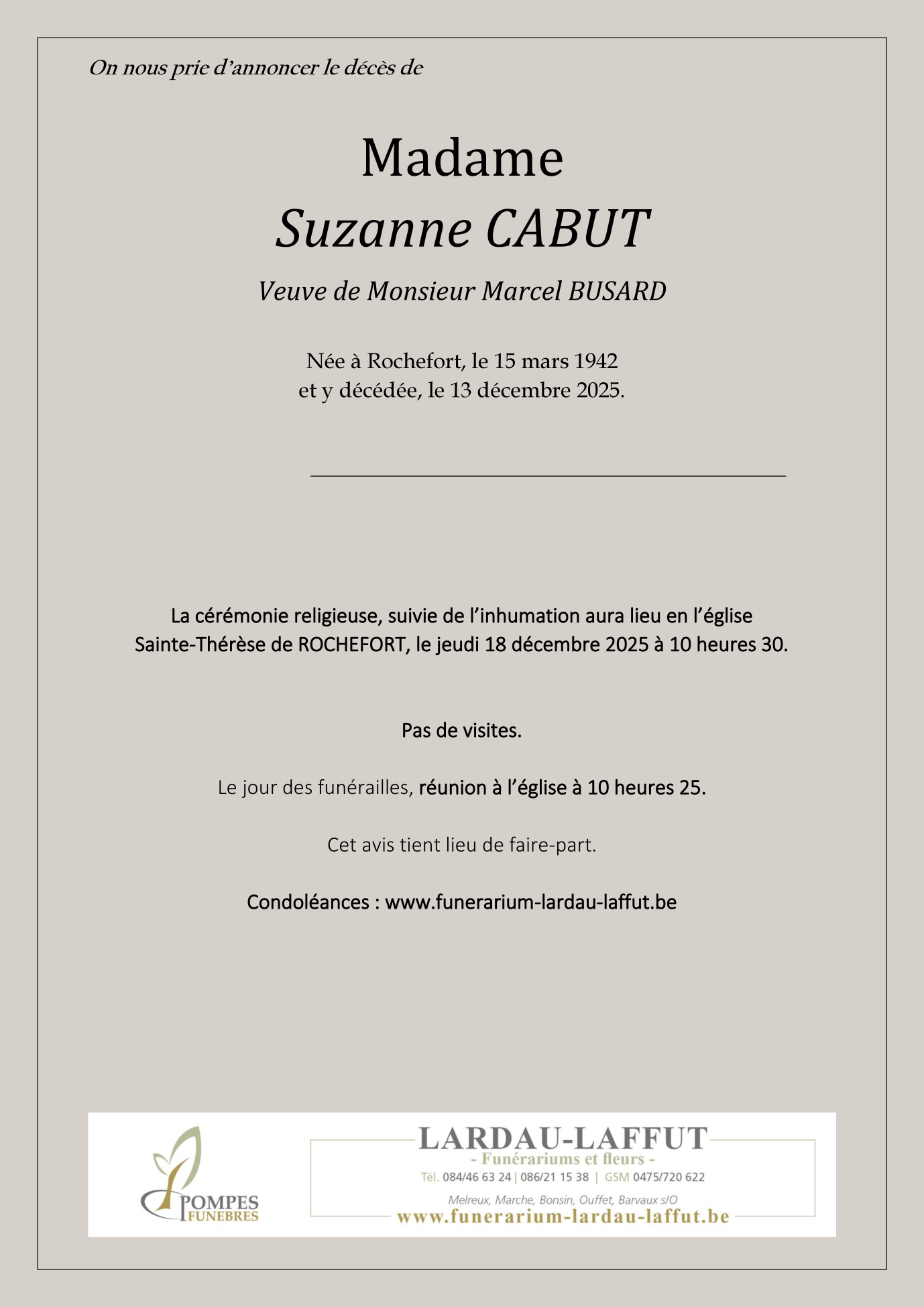 Décédée à Rochefort (5580, Belgique) le samedi 13 décembre 2025 à l'âge de 83 ans