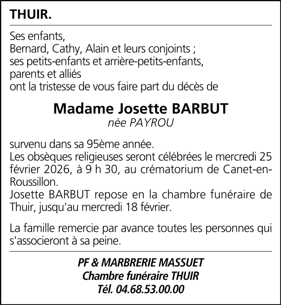 Madame Josette BARBUT née PAYROU