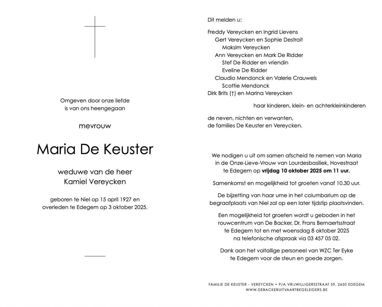 Décédée à Edegem (2650, Belgique) le vendredi 3 octobre 2025 à l'âge de 98 ans