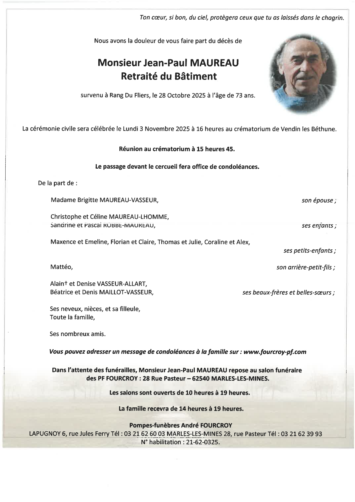 Décédé à Rang Du Fliers (62600, France) le mardi 28 octobre 2025 à l'âge de 73 ans