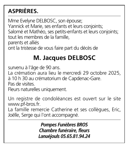 Died in Asprières (12700, France) on 26 October 2025 at the age of 90 years