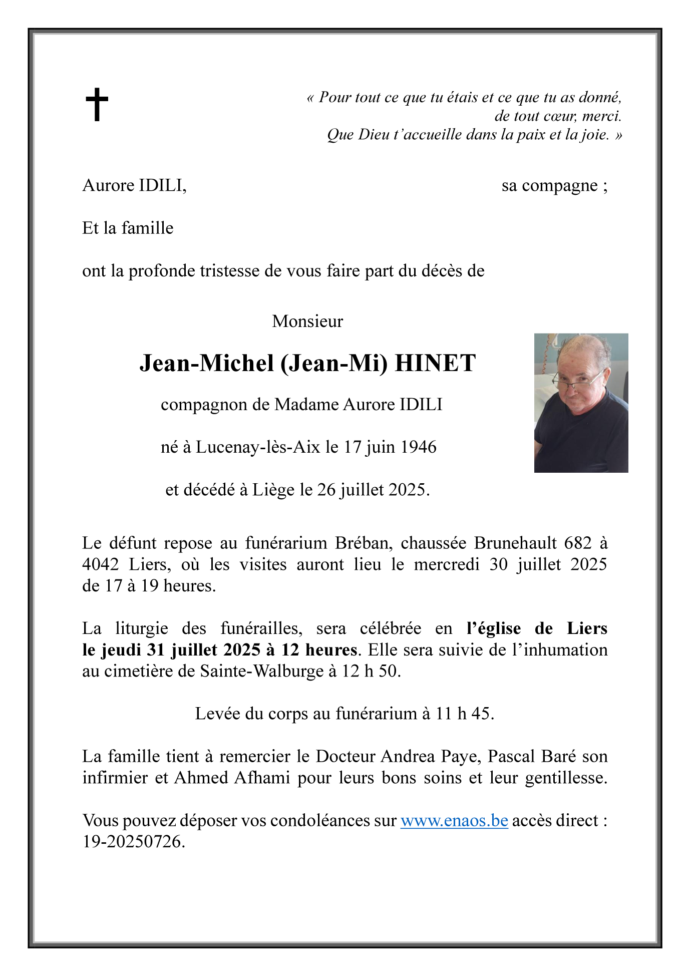 Overleden te Liège (4000, België) op zaterdag 26 juli 2025 op 79-jarige leeftijd