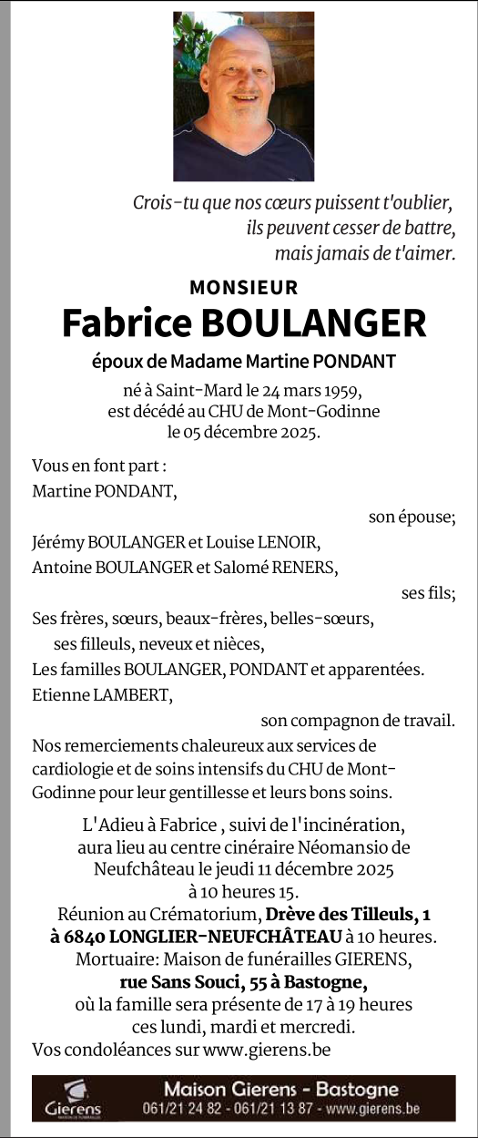 Décédé à Yvoir (5530, Belgique) le vendredi 5 décembre 2025 à l'âge de 66 ans