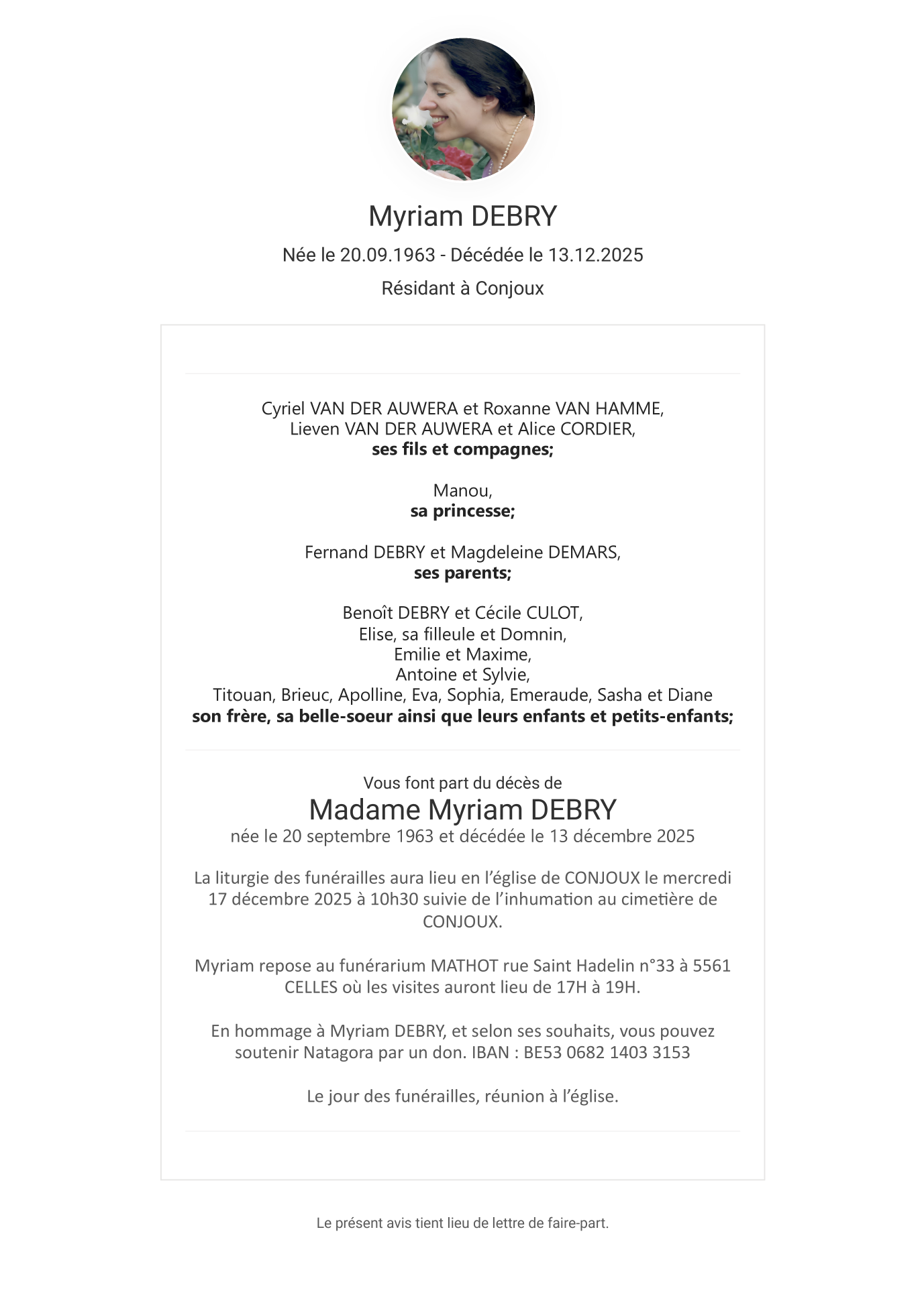 Décédée à Conjoux (5590, Belgique) le samedi 13 décembre 2025 à l'âge de 62 ans