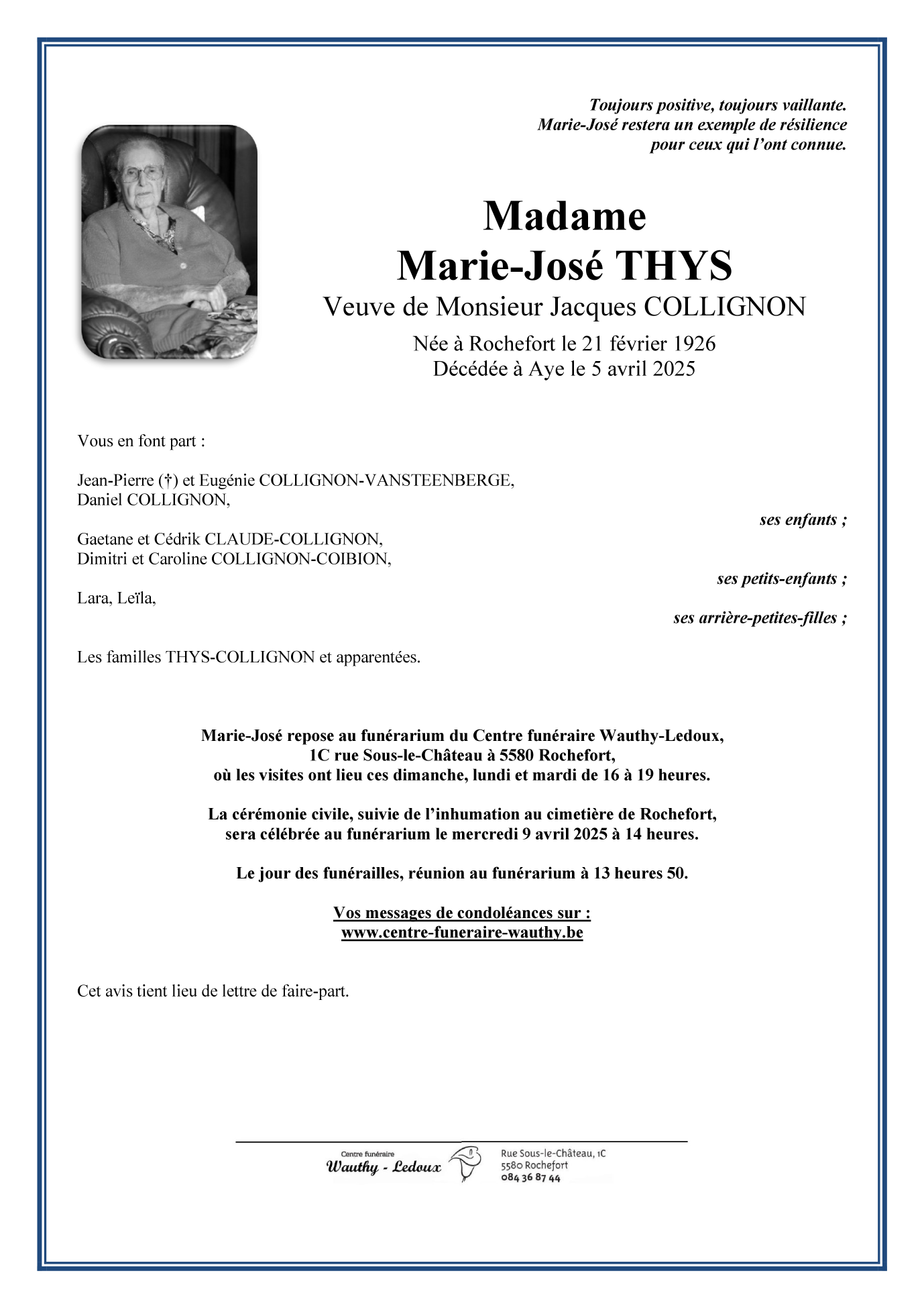 Décédée à Aye (6900, Belgique) le samedi 5 avril 2025 à l'âge de 99 ans