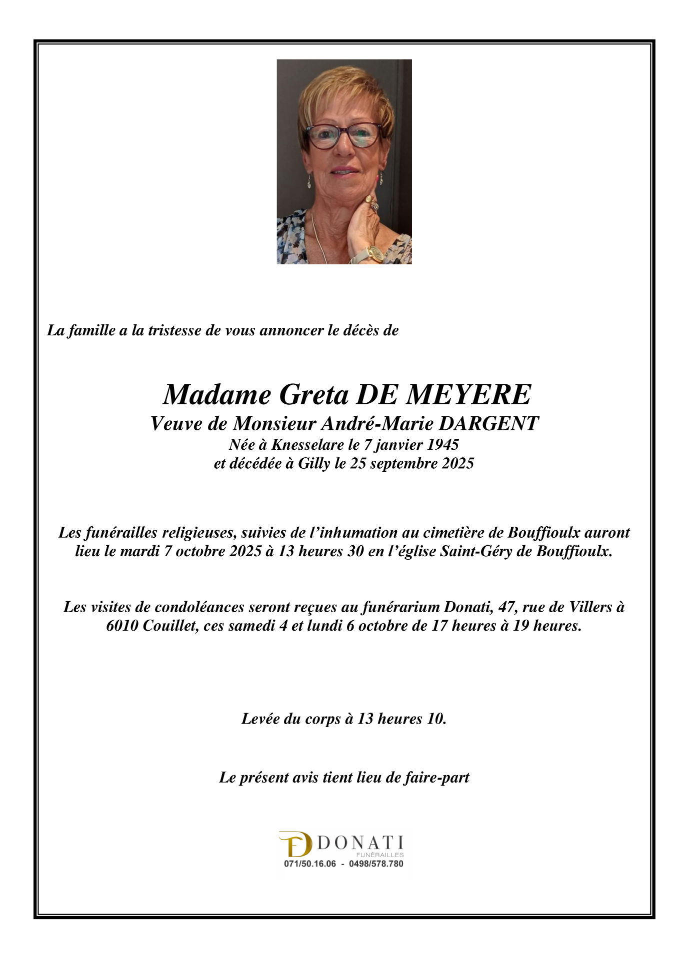 Décédée à Gilly (6060, Belgique) le jeudi 25 septembre 2025 à l'âge de 80 ans