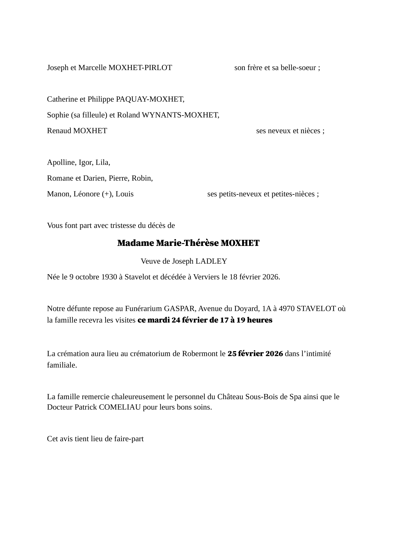 Décédée à Verviers (4800, Belgique) le mercredi 18 février 2026 à l'âge de 95 ans