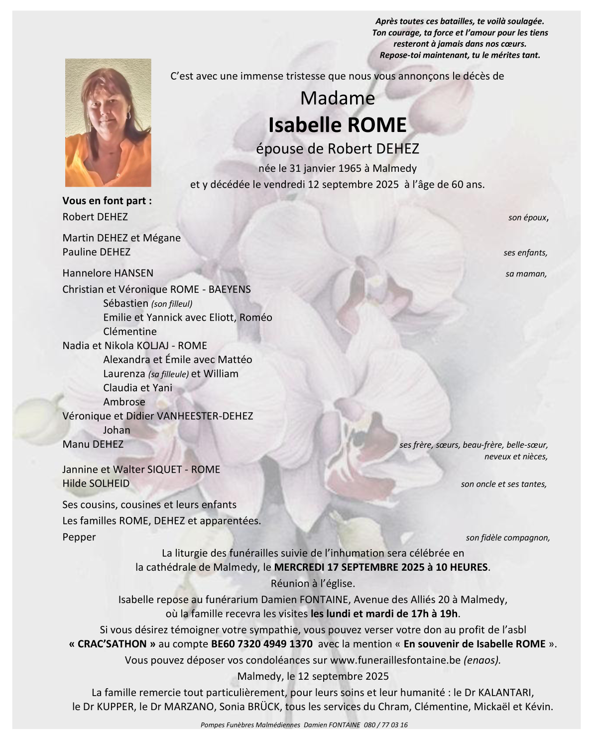 Fallecida en Malmedy (4960, Bélgica) el viernes, 12 de septiembre de 2025 a la edad de 60 años