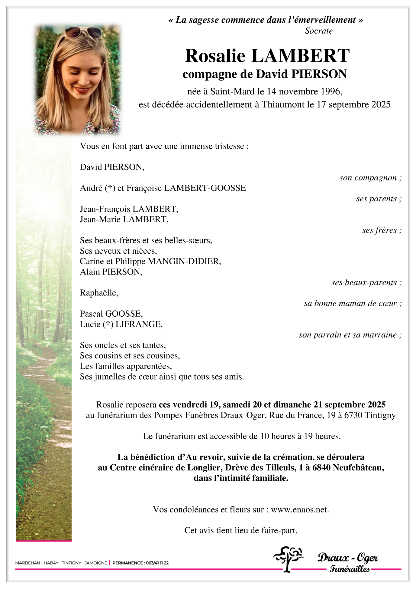 Décédée à Thiaumont (6717, Belgique) le mercredi 17 septembre 2025 à l'âge de 28 ans