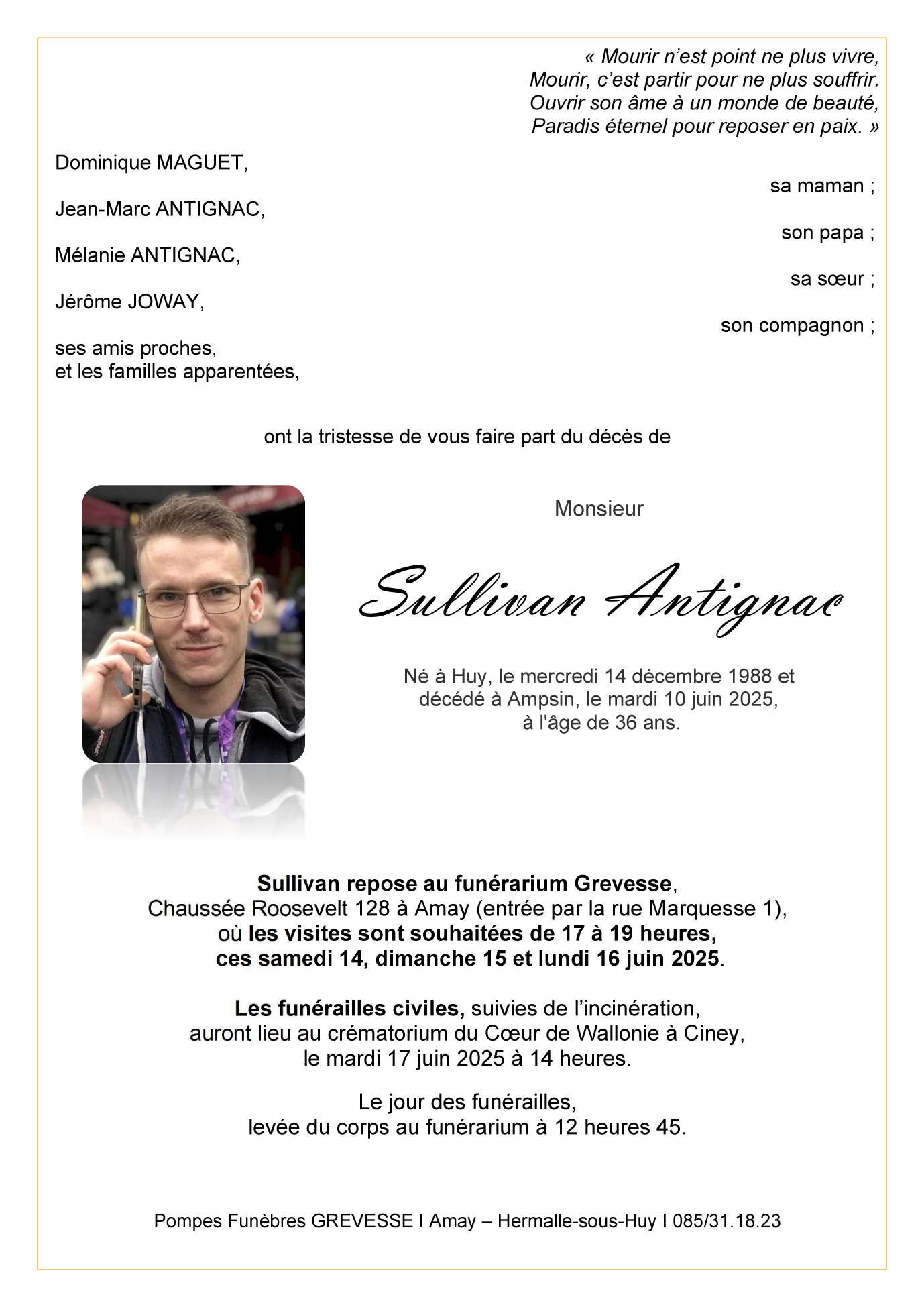 Décédé à Ampsin (4540, Belgique) le mardi 10 juin 2025 à l'âge de 36 ans