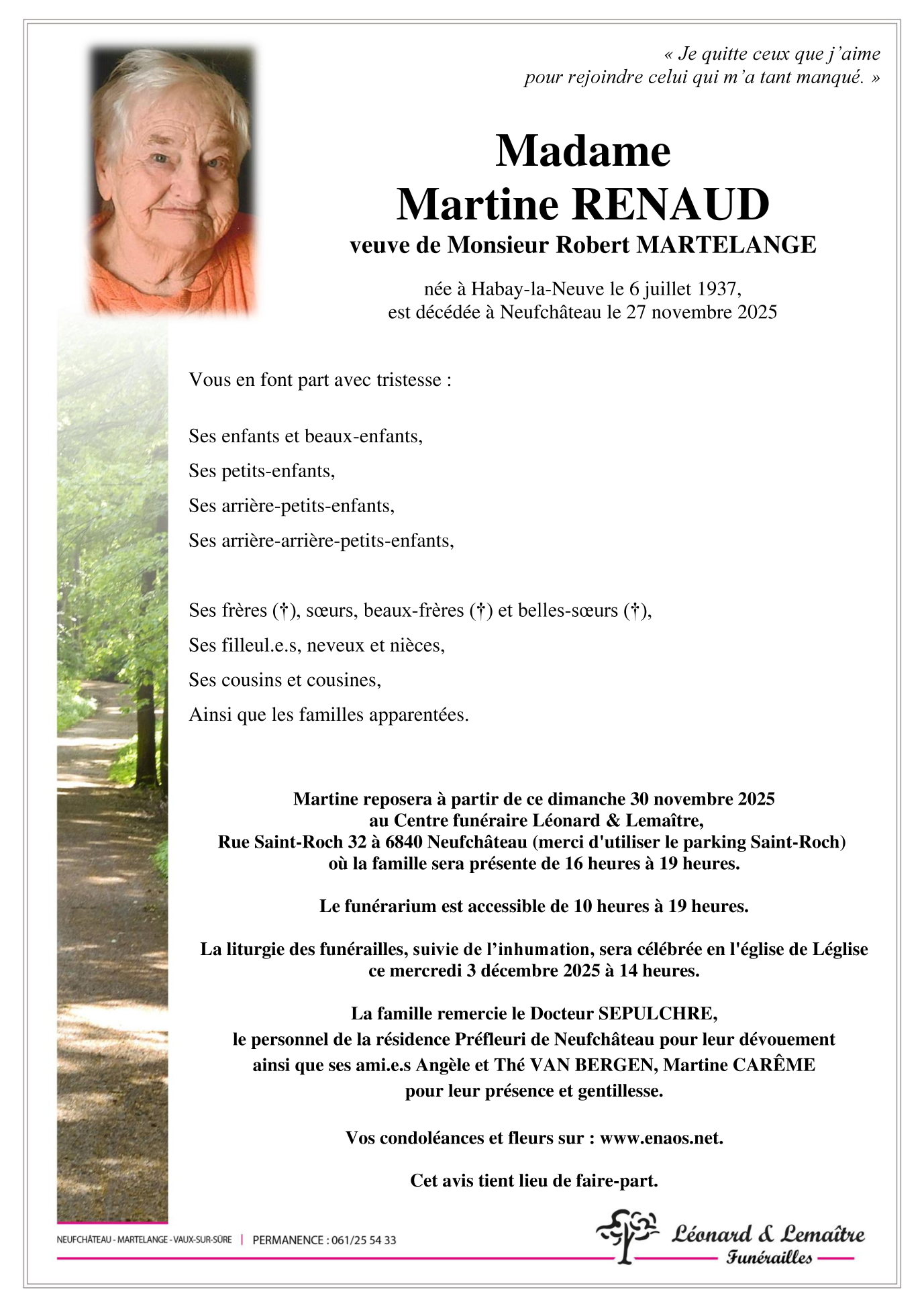 Fallecida en Neufchâteau (6840, Bélgica) el jueves, 27 de noviembre de 2025 a la edad de 88 años