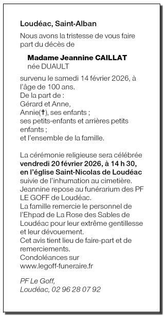 Overleden te Loudéac (22600, Frankrijk) op zaterdag 14 februari 2026 op 100-jarige leeftijd